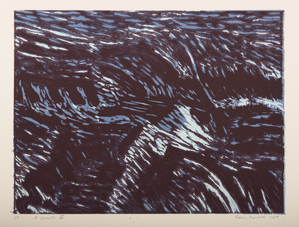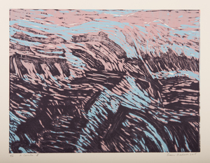 2015Het water stroomt over de rotsen bij A Coruña. In diverse kleurstellingen gemaakt omdat de aanblik sterk afhankelijk is van het weer, het licht. Techniek: houtsnede.
