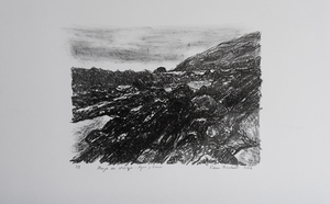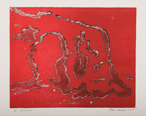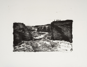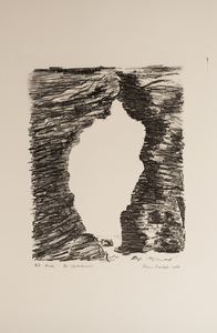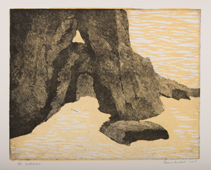 2015Bij eb lijken de rotsen kathedralen waar je rond kunt dwalen. Techniek: lijnets met aquatint over houtsnede.