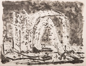2014Achteroverleunend aan de kust. Schoenen uit. Zicht op een rots die uitloopt in zee, met een uitholling waar je onderdoor kunt waden. Techniek: litho ofwel steendruk.