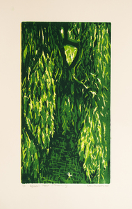 2020Houtsnede. De treurwilg nodigt je uit dichtbij te komen om je te laten troosten door zijn kleurige hangende bladeren