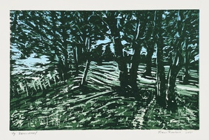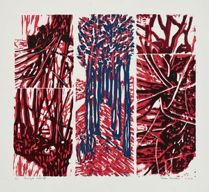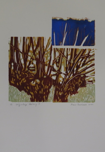 2022Langs het Wijchen's meer staan veel wilgen. De wilgentoppen zijn landschappen op zichzelf. Deze trof ik aan bij Diepvoorde. Techniek: lino.