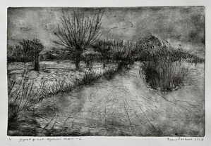 2022Deze ets is er een van een drieluik die gezamenlijk een panorama vormen van het Wijchen's meer in de winter, vanaf het ijs.